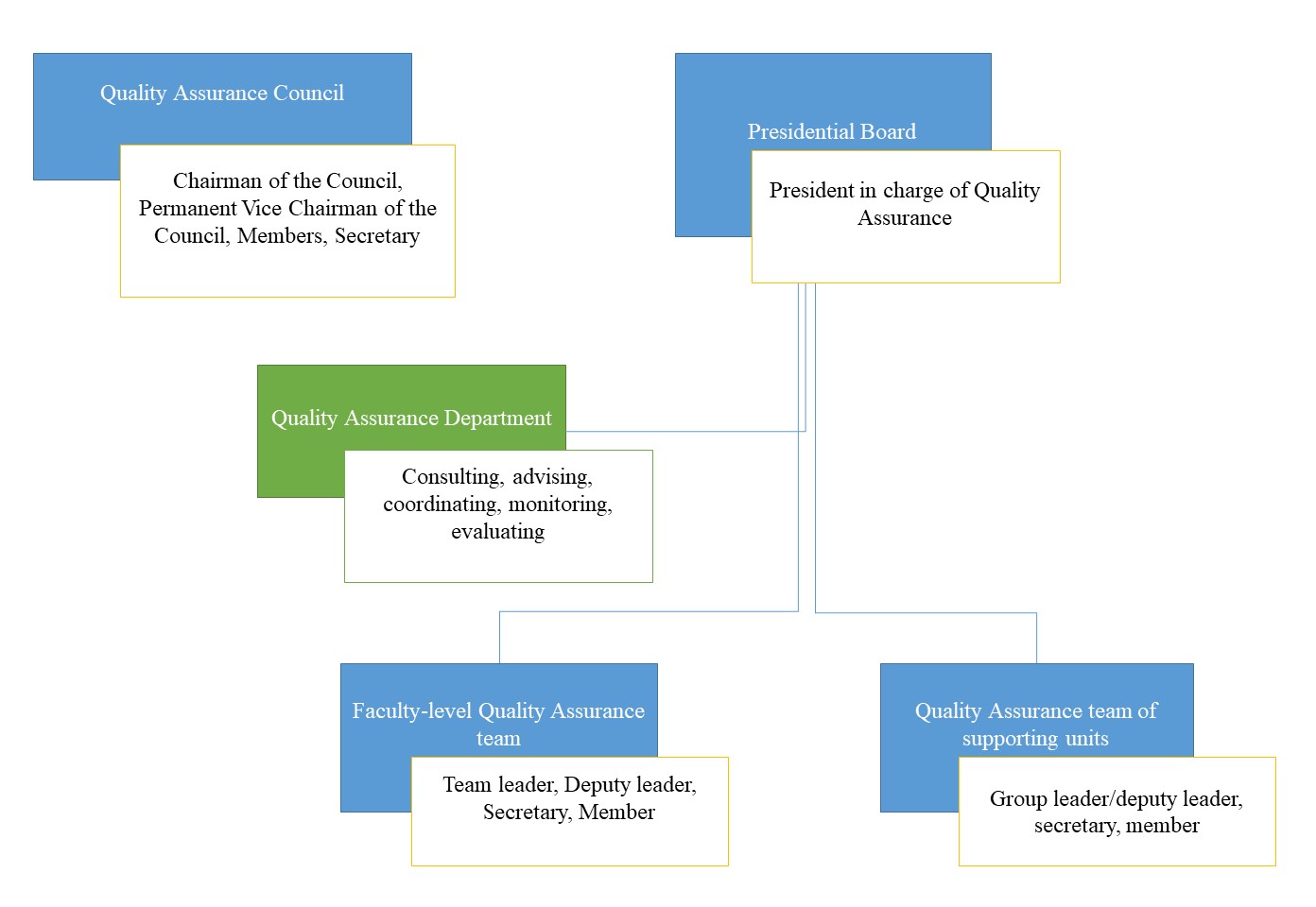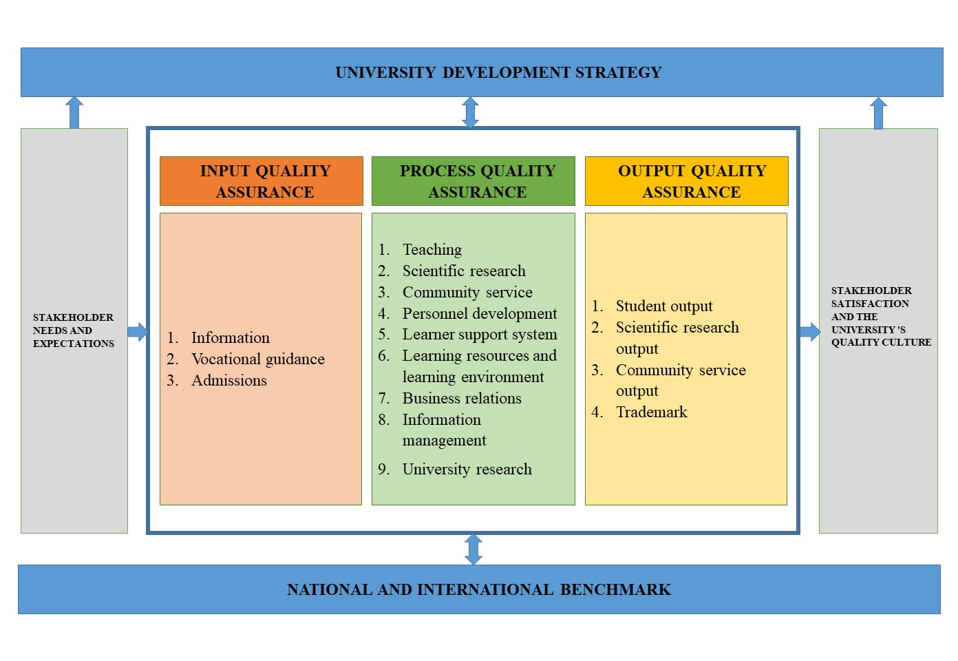 - At the tactical level, each year, the Quality Assurance Strategy is concretized into Quality objectives, which serves as the foundation for all units across the university to develop a work implementation plan, which includes (i) self-assessment, provision of training programs, (ii) enhancement of post-assessment activities outside the school level, (iii) database and Quality objectives, (iv) stakeholders information collection, and (v) Quality Assurance briefings and technical trainings.