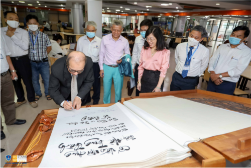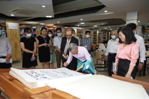 Hình ảnh Trưởng đoàn và thư ký đoàn ký kỷ niệm vào Sổ thư pháp