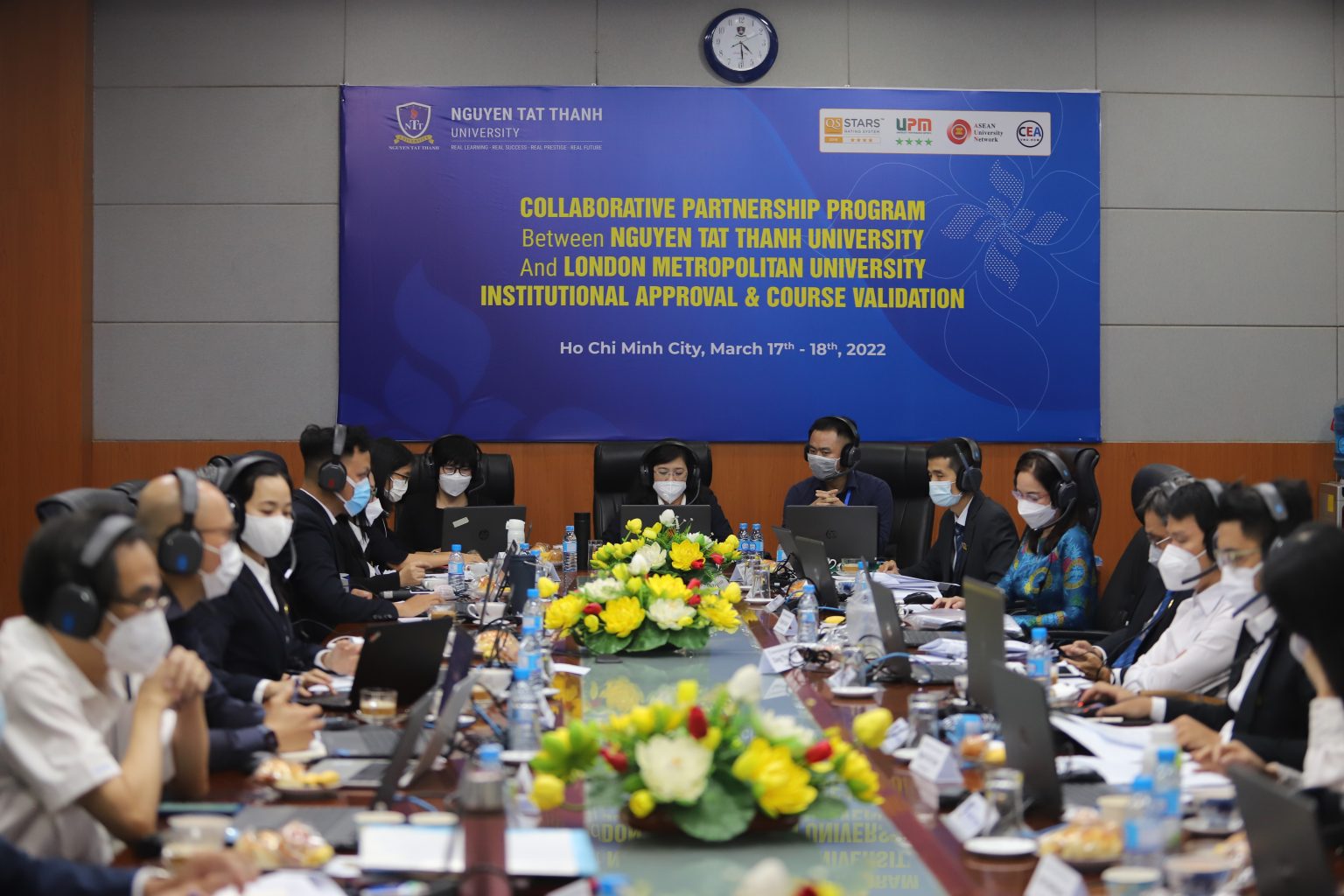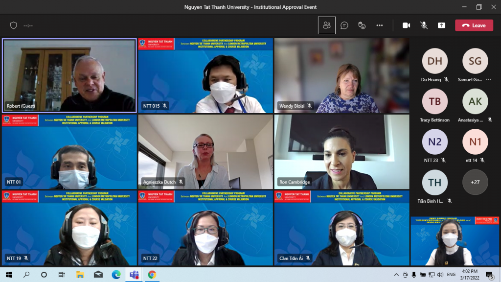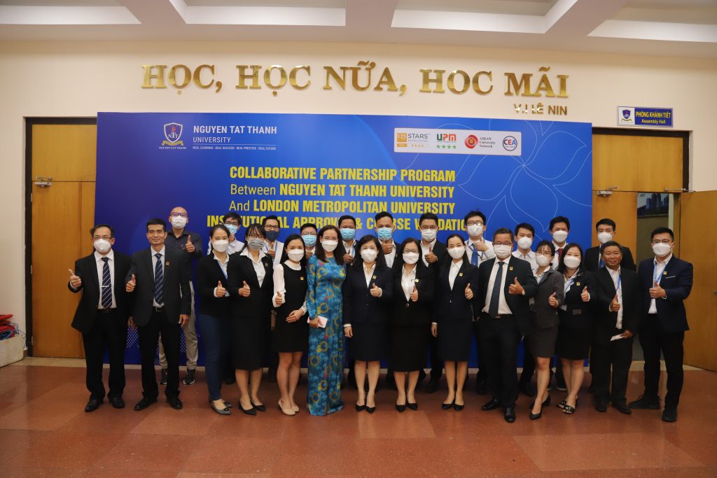 Sau một năm trao đổi thông tin và tiến hành các bước chuẩn bị cho việc hợp tác, xây dựng chương trình, chuẩn bị hồ sơ năng lực, vào ngày 17 – 18/03/2022, Trường ĐH Nguyễn Tất Thành và Đại học London Metropolitan (London Met) đã chính thức tham dự và phản biện thành công các phiên đánh giá tổng thể về nhà trường và các chương trình hợp tác: thạc sĩ ngành Quản trị kinh doanh, cử nhân ngành Marketing, cử nhân ngành Quản trị kinh doanh, cử nhân ngành Quản trị vận tải và hàng không (trong 2 ngày 17 và 18/03/2022). Chương trình được tổ chức thông qua hình thức trực tuyến – Microsoft Team dưới sự chủ trì, điều hành của Ban đánh giá ngoài gồm các thành viên thuộc London Met và các tổ chức Giáo dục khác của Vương quốc Anh.